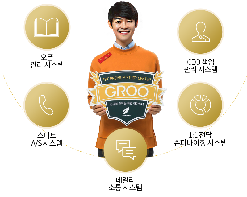 GROO All 케어시스템 대체불가! 체계적인 가맹점 관리 시스템 구현 그루스터디만의 All케어시스템 창업의 시작부터 끝까지 책임지는그루스터디만의 가맹점 관리 시스템 STEP 01 오픈관리 시스템 STEP 02 스마트 A/S 시스템 STEP 03 데일리 소통 시스템 STEP 04 1:1 전담 슈퍼바이징 시스템 STEP 05 CEO 책임관리 시스템 다년간의 노하우로 준비된 그루스터디만의 차별화된 노하우로예비 창업자 분들에게 완벽한 가맹관리를 약속 드립니다! The Premium Study Center GROO 그루 스터디카페는 공부의 신 강성태의 노하우를 반영하여“학습 습관형성과 능률을 높일 수 있는 공간”을 제공합니다.